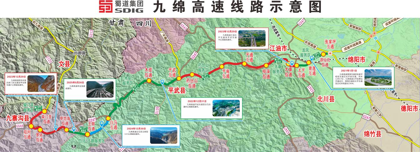 九綿高速是連接川西北重要旅游目的地九寨溝與綿陽的交通大動(dòng)脈。項(xiàng)目全長(zhǎng)245.809公里,批復(fù)概算總投資409.98億元,采用雙向四車道高速公路標(biāo)準(zhǔn)建設(shè),設(shè)計(jì)時(shí)速80公里。全線共設(shè)橋梁131座,隧道45座,互通式立交18處,收費(fèi)站17個(gè),服務(wù)區(qū)6處,橋隧比82.15%,項(xiàng)目由蜀道集團(tuán)川高公司主導(dǎo)投資、公路設(shè)計(jì)院公司參與設(shè)計(jì)、四川路橋參建。九綿高速分段建成通車,2021年張家坪至江油太平段建成通車,2022年平武至白馬段建成通車,2023年江油太平至平武段、九寨溝柴門關(guān)至甲勿海段建成通車,2024年白馬至王朗段建成通車,本次通車的是甲勿海至王朗段。九綿高速北接G8513平?jīng)鲋辆d陽高速公路甘肅段,南連G5京昆高速?gòu)V元至綿陽段和G93成渝地區(qū)環(huán)線綿陽至遂寧段,在平武與廣平高速相連,構(gòu)成川、甘兩省又一條便捷的省際公路運(yùn)輸大通道,與G5京昆高速、S18廣平高速等高速公路一道,形成“1條主通道(G5京昆高速)+2條區(qū)域聯(lián)動(dòng)線”的北向出川大通道高速網(wǎng)。